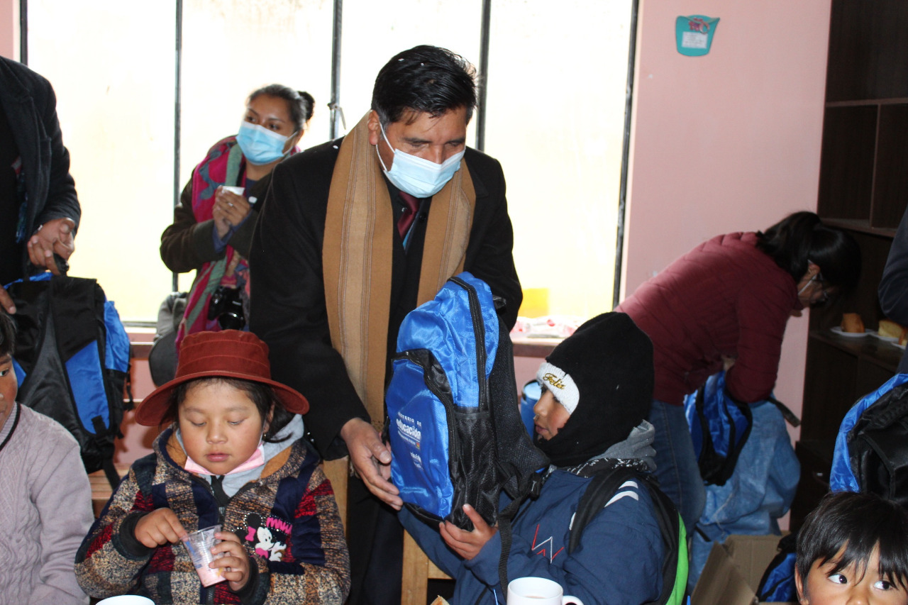 La Paz, 12 de abril (UNICOM – MINEDU): El Ministro de Educación, Prof, Adrián Quelca Tarqui, agasajó a un grupo de niños de la unidad educativa Cota Cota Baja, del municipio de Huarina, con quienes compartió un desayuno , entregó equipamiento, material y una mochila escolar, en ocasión del Día del Niño Boliviano.