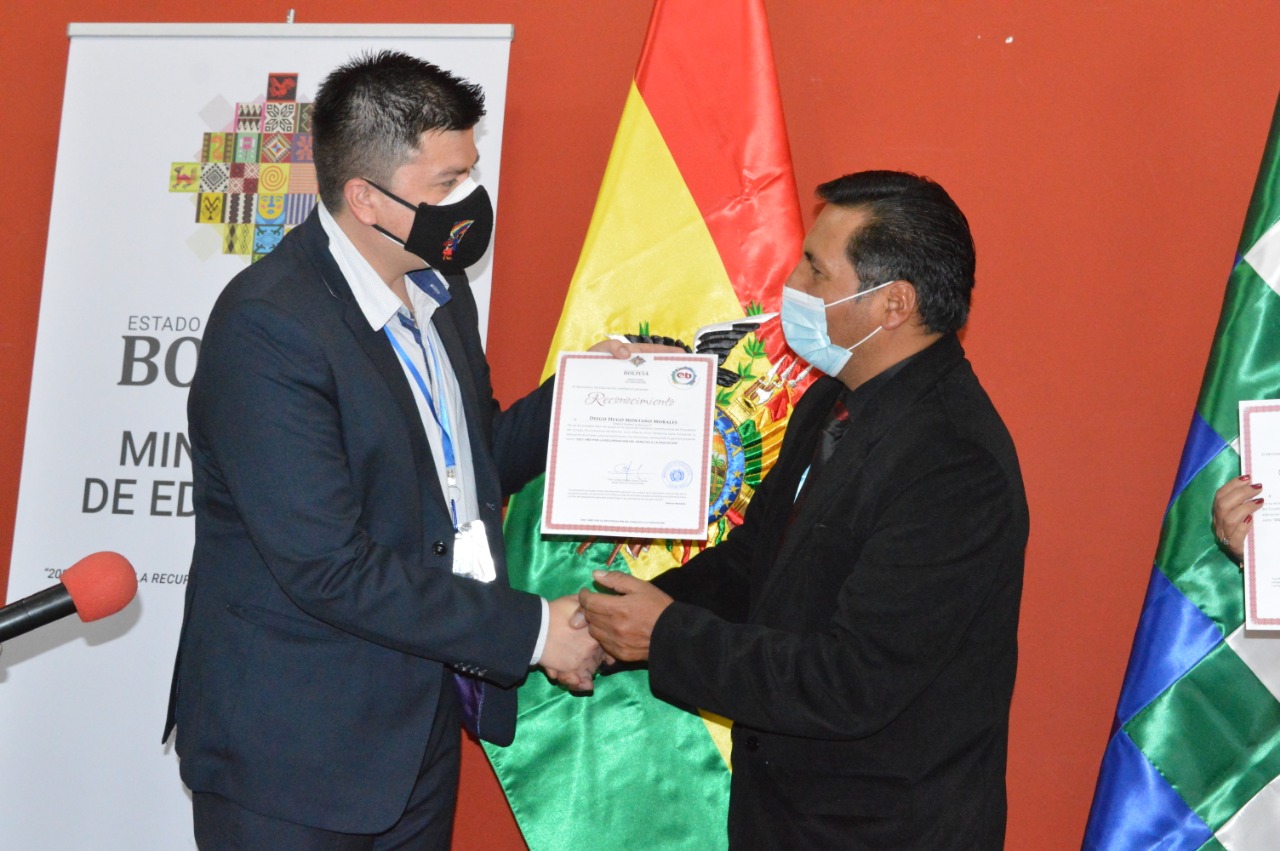 La Paz, 23 de abril (UNICOM – MINEDU): El Ministro de Educación, Prof. Adrián Quelca Tarqui, entregó este viernes un reconocimiento al canal estatal Bolivia Tv por su aporte a la educación, mediante la transmisión de la franja Educa Bolivia. La viceministra de Comunicación, Gabriela Alcón y el gerente de Bolivia Tv, Hugo Montaño, recibieron el galardón.