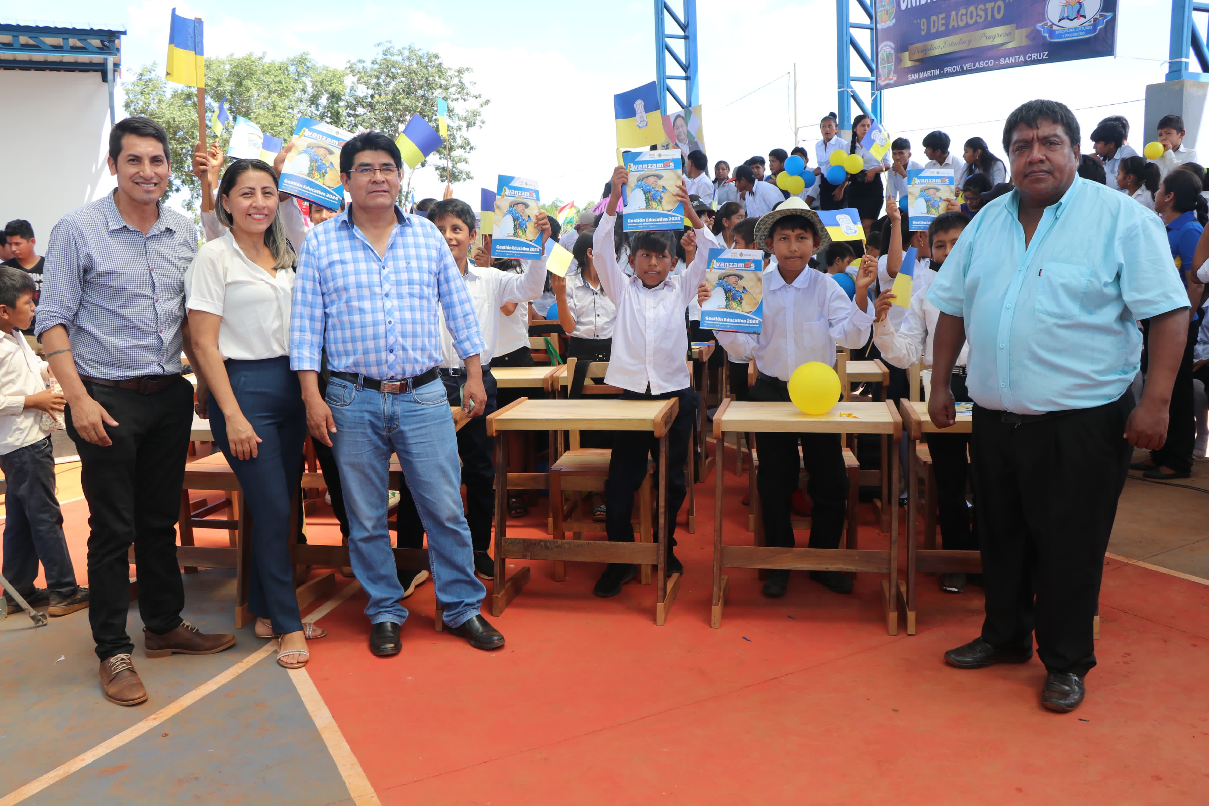 Santa Cruz, 11 de marzo de 2024 (Unicom – Minedu).- El presidente Luis Alberto Arce Catacora – en compañía del ministro de Educación, Omar Veliz Ramos – realizó la entrega de la Unidad Educativa “9 de Agosto”, ubicada en el cantón Santa Rosa de la Roca, localidad San Martín del municipio San Ignacio de Velasco, departamento de Santa Cruz.