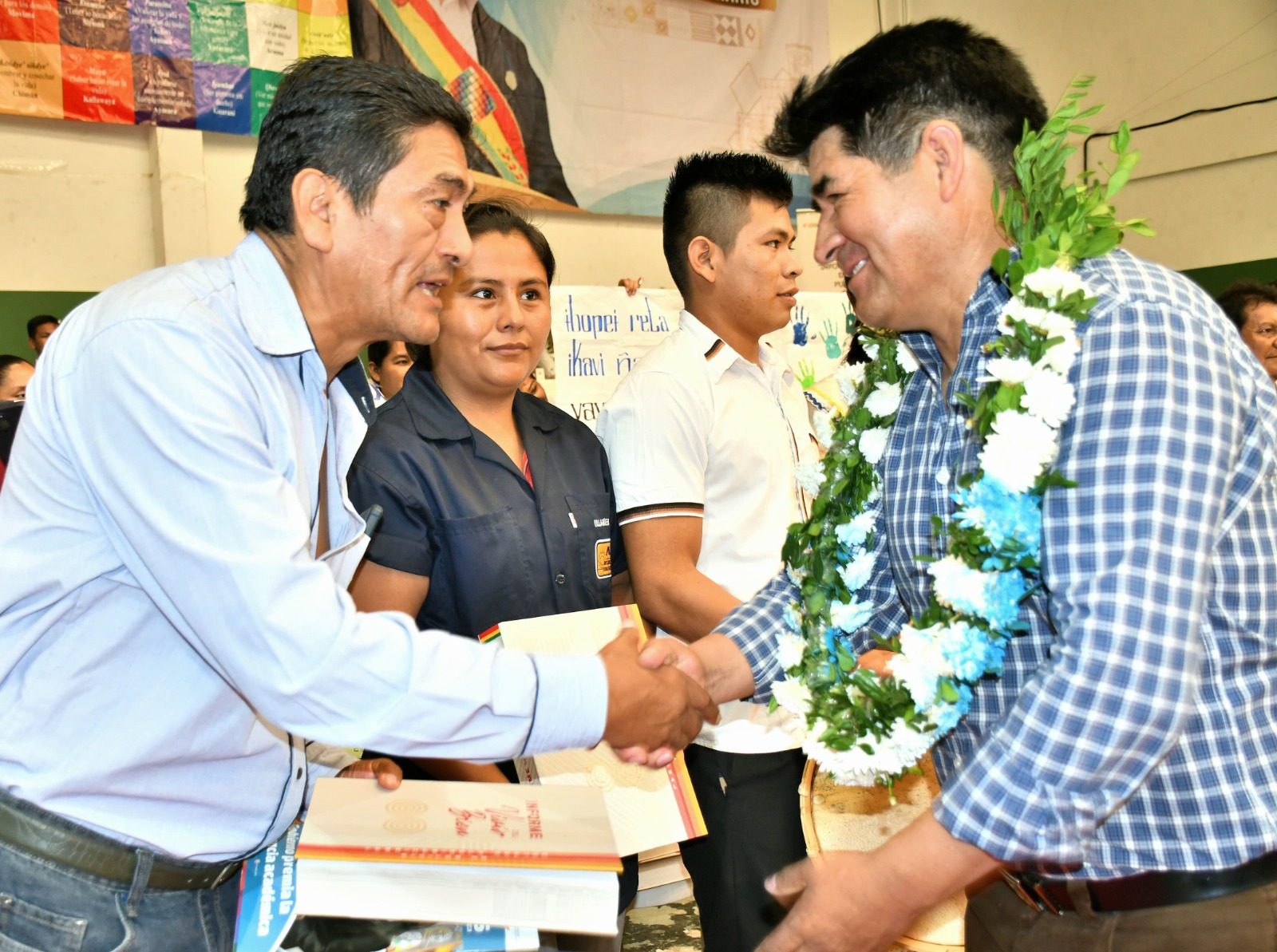 Santa Cruz, 21 de marzo de 2024 (Unicom – Minedu).- El vicepresidente David Choquehuanca y el ministro de Educación, Omar Veliz Ramos, realizaron la entrega de varias colecciones de libros para las bibliotecas de unidades educativas y Escuelas Superiores de Formación de Maestros (ESFMs) del departamento de Santa Cruz, durante el evento denominado: “Hacia el fortalecimiento del Sistema Educativo Plurinacional, desde los códigos del Vivir Bien”.