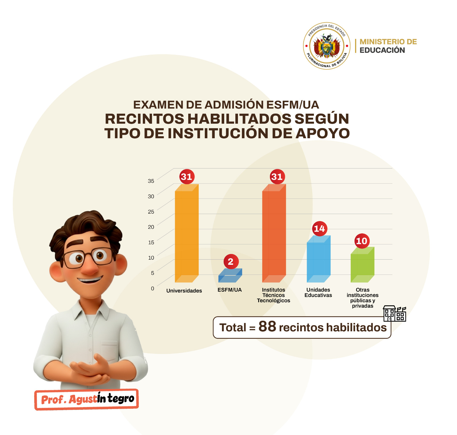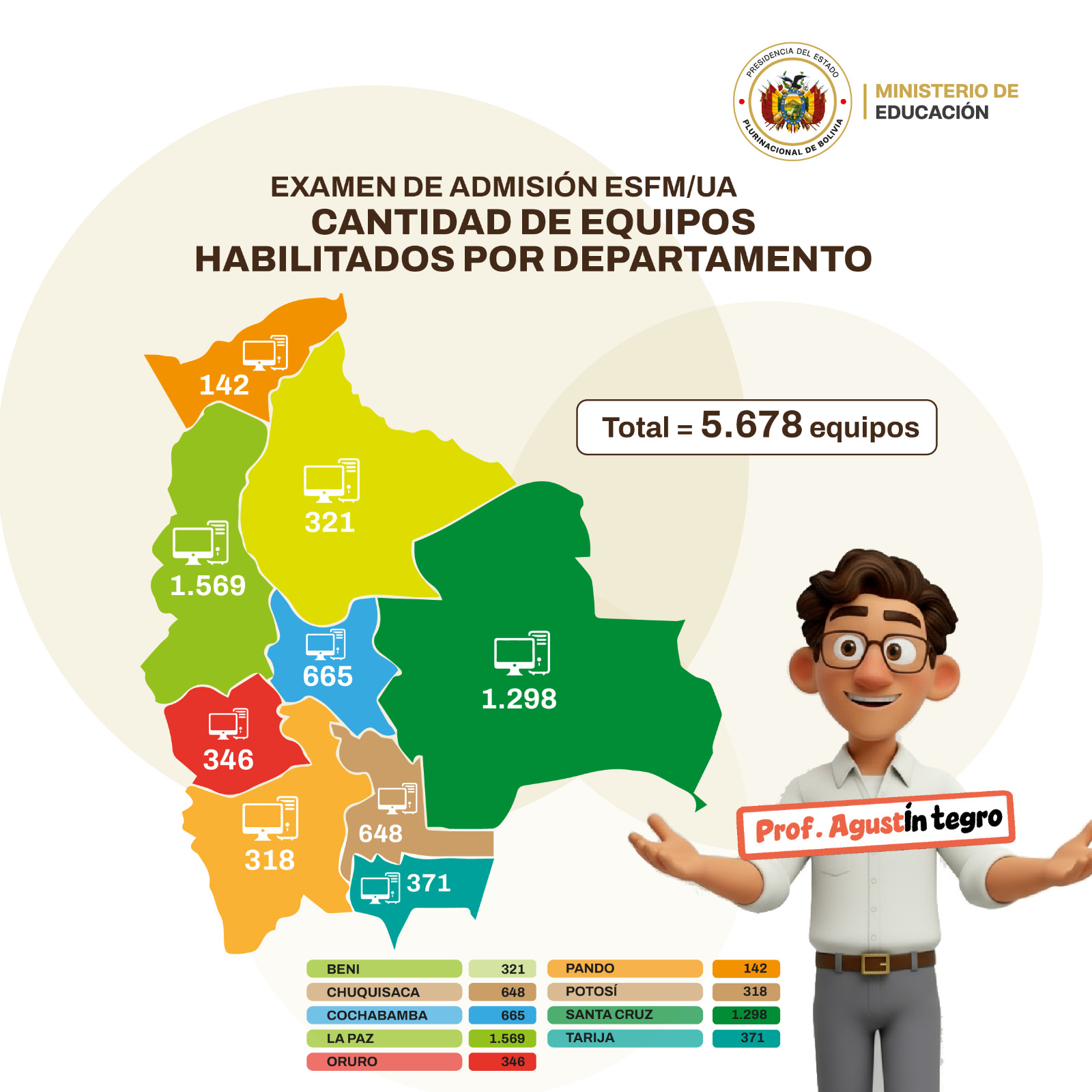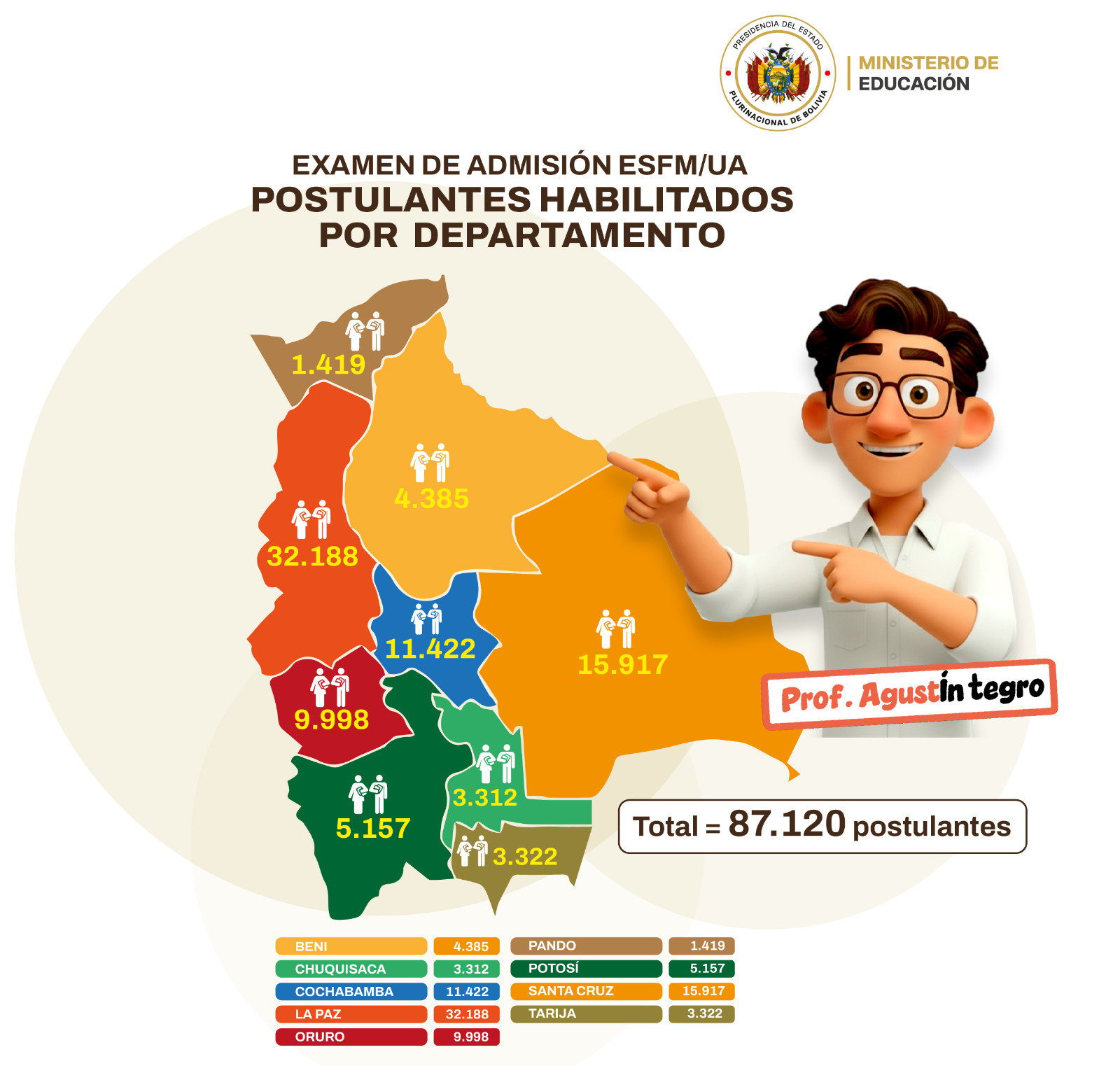 La gestión 2026 presenta 87.120 postulantes habilitados a nivel nacional para dar el examen de admisión; y se cuenta con un total de 3.010 plazas, distribuidas por departamento, ESFM/UA y especialidad. ¿Quiénes tendrán la oportunidad de formarse como educadores? Aquellos jóvenes aspirantes que obtengan las mejores calificaciones del examen de admisión, serán los elegidos.