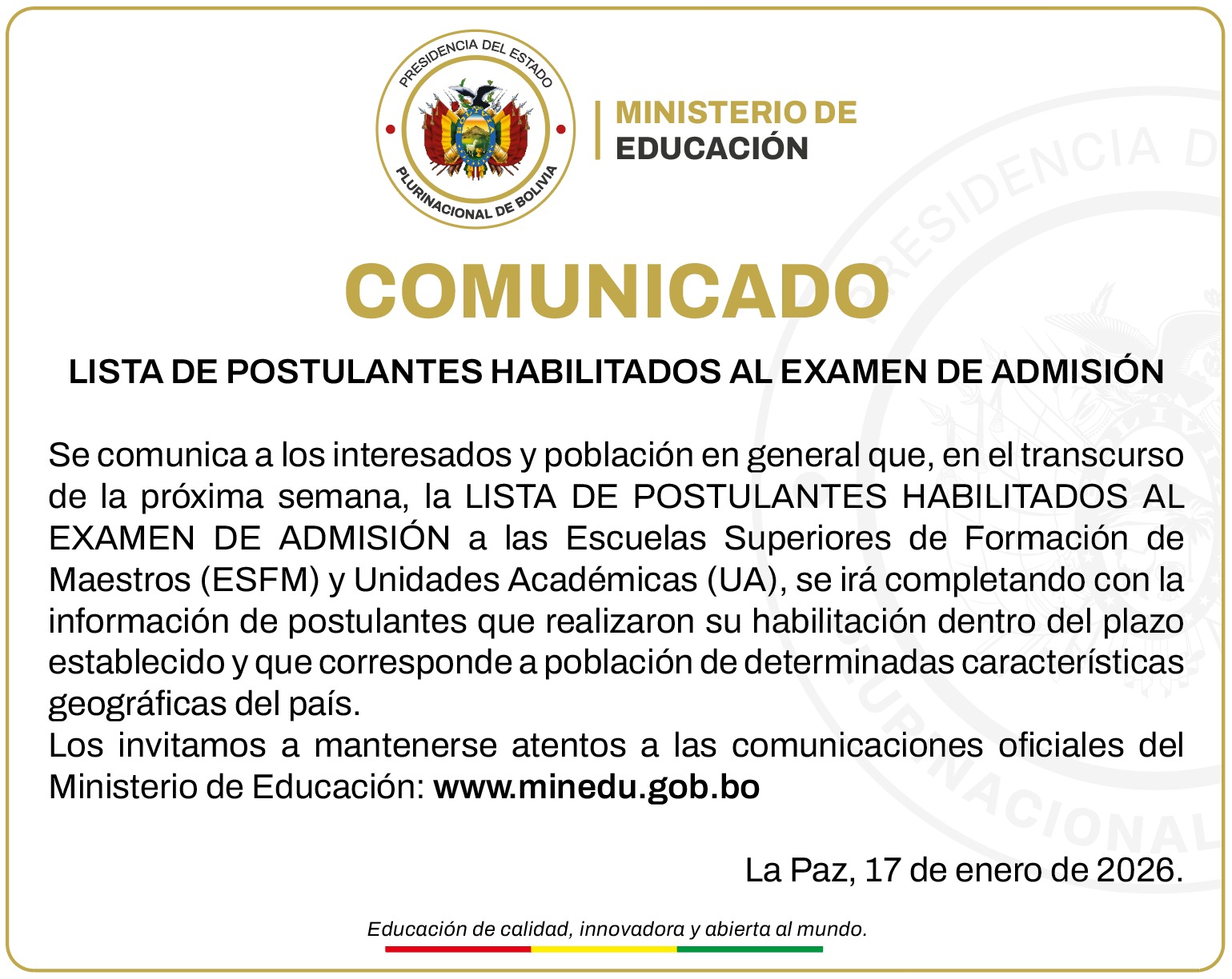 Los invitamos a mantenerse atentos a las comunicaciones oficiales del Ministerio de Educación: www.minedu.gob.bo