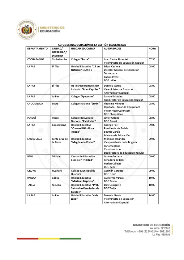 La Paz, 01 de febrero de 2026 (Ministerio de Educación - UNICOM).- El lunes 02 de febrero inicia oficialmente la gestión escolar 2026 en todo el territorio nacional, en un contexto marcado por el optimismo, la esperanza y el compromiso con la mejora de la calidad educativa, a partir de la puesta en vigencia de la normativa 0001/2026.